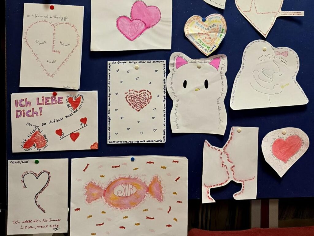 Para celebrar o Dia de São Valentim, os alunos de alemão das turmas 8ºA e 12ºH criaram poemas visuais inspirados na temática do amor e da amizade (Liebe und Freundschaft). Estes trabalhos encontram-se expostos na EB 2, 3 de São Pedro do Mar.