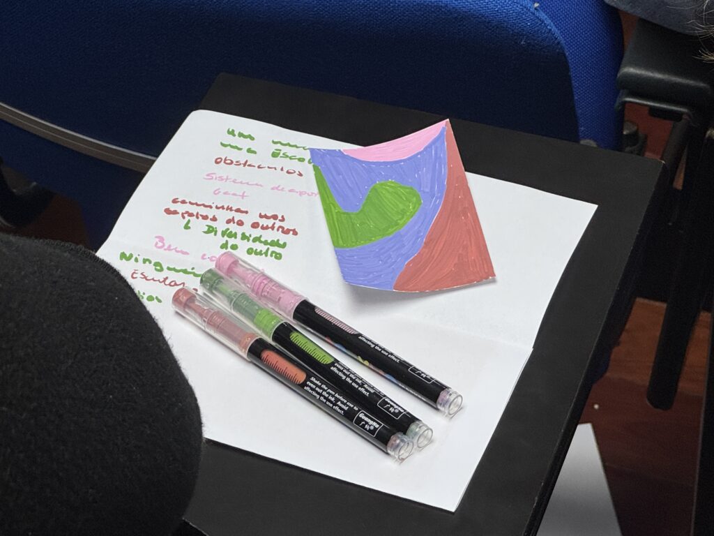 Logo no início, cada participante recebeu um pequeno cartão e canetas de feltro. Um gesto simples, mas carregado de intenção: cada um foi convidado a deixar a sua marca numa tela coletiva, onde se desenhava, em pano de fundo, o rosto da patrona — Laura Ayres.