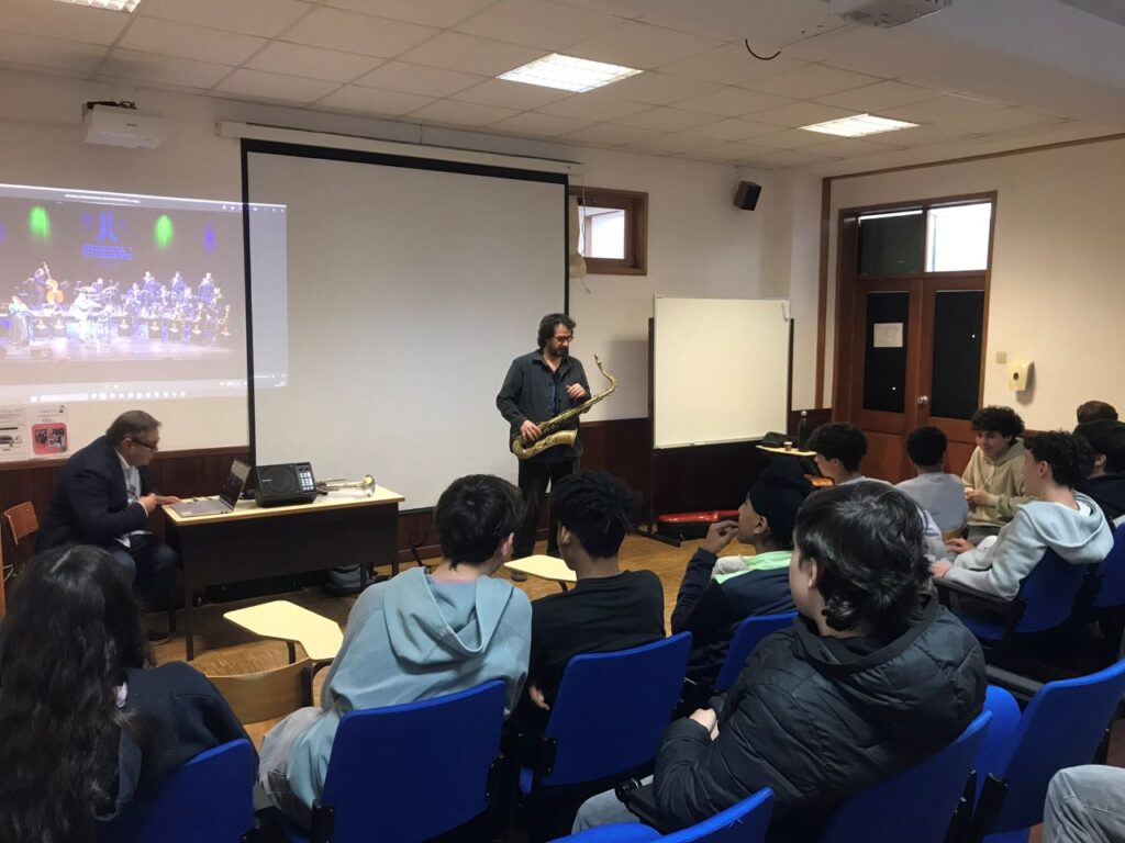 A sessão, promovida pela Orquestra de Jazz do Algarve e dinamizada pelos músicos Hugo Alves e Luís Miguel, conjugou a explicação teórica, o enquadramento histórico e demonstrações práticas, culminando numa apresentação musical em formato de miniconcerto. Esta abordagem permitiu aos alunos compreender melhor a linguagem do Jazz, os seus ritmos, a improvisação e a importância da escuta ativa.