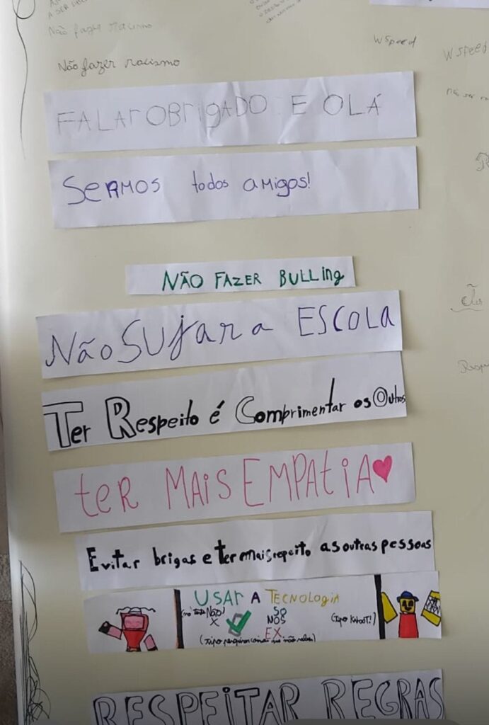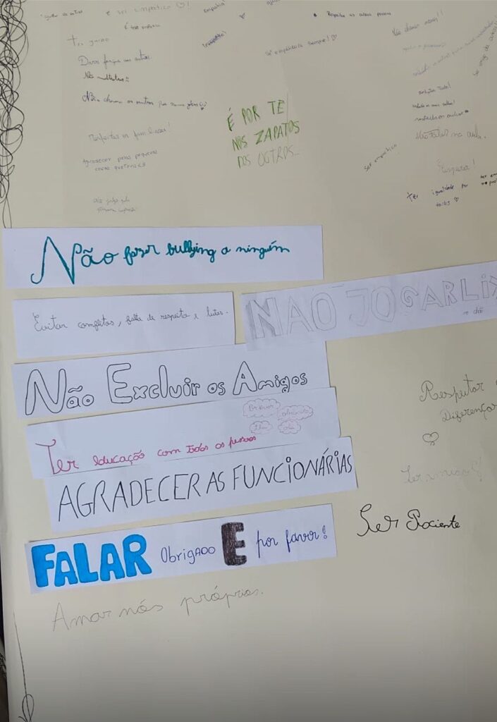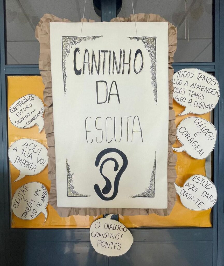 Esta ação teve como objetivo sensibilizar toda a comunidade escolar para a importância do diálogo, da empatia, do respeito e da resolução não violenta de conflitos no dia a dia escolar. Durante a semana, cada turma teve a oportunidade de visitar o mural, deixando a sua marca através de uma palavra ou frases que simbolizassem o seu compromisso com uma convivência mais harmoniosa.